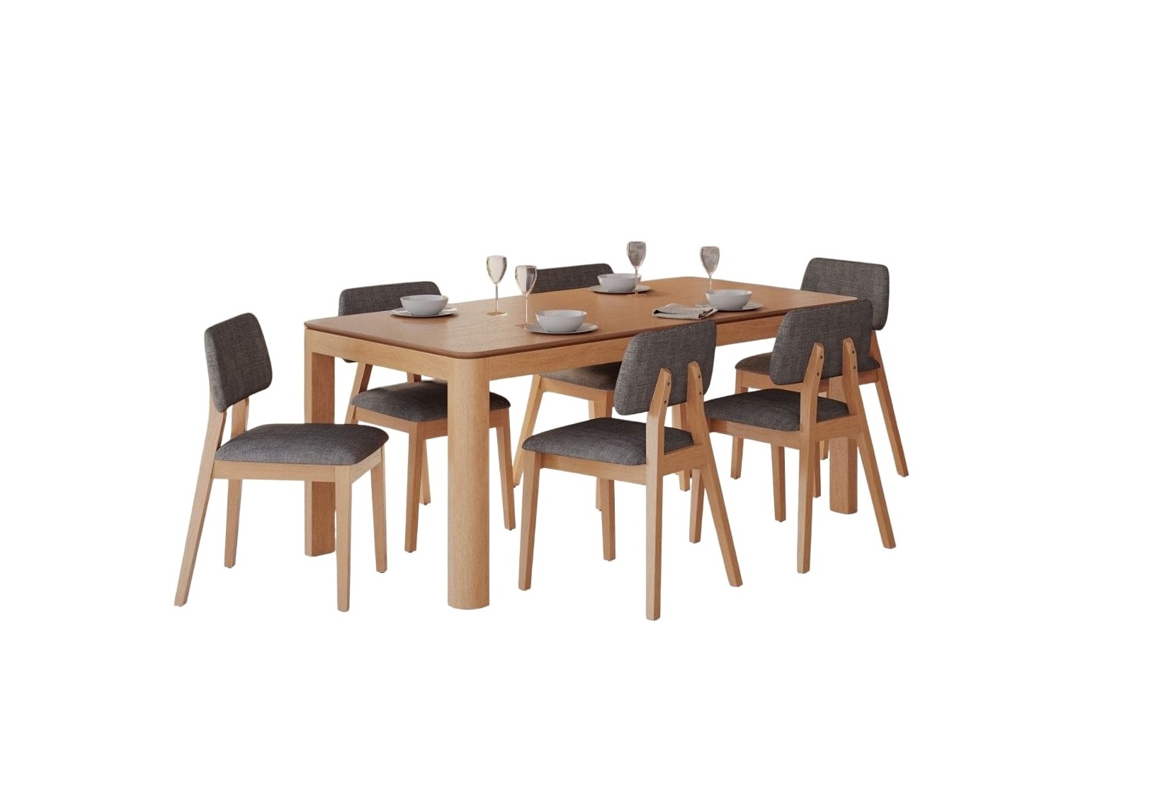 Este conjunto de comedor aporta un toque de elegancia y diseño a cualquier ambiente, fusionando funcionalidad y estilo en cada detalle. La mesa Lacar, de 1.60 x 0.90 metros, está fabricada en madera de eucalipto, un material resistente que ofrece una apariencia natural y refinada. Complementando esta pieza central, las 6 sillas Rosse están hechas en madera maciza, con un diseño clásico y un tapizado de pana antimanchas que combina confort y durabilidad, ideal para el uso diario.