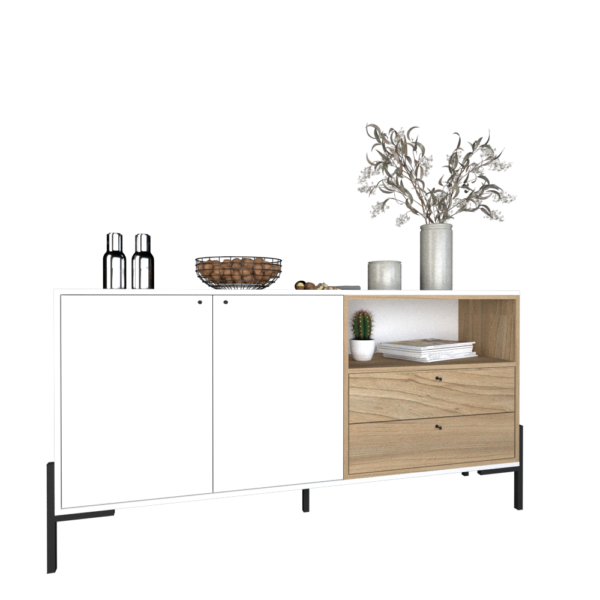 Bahiut fabricado en madera paraíso combinado con puertas laqueadas blancas