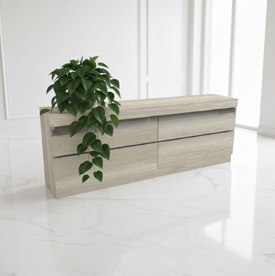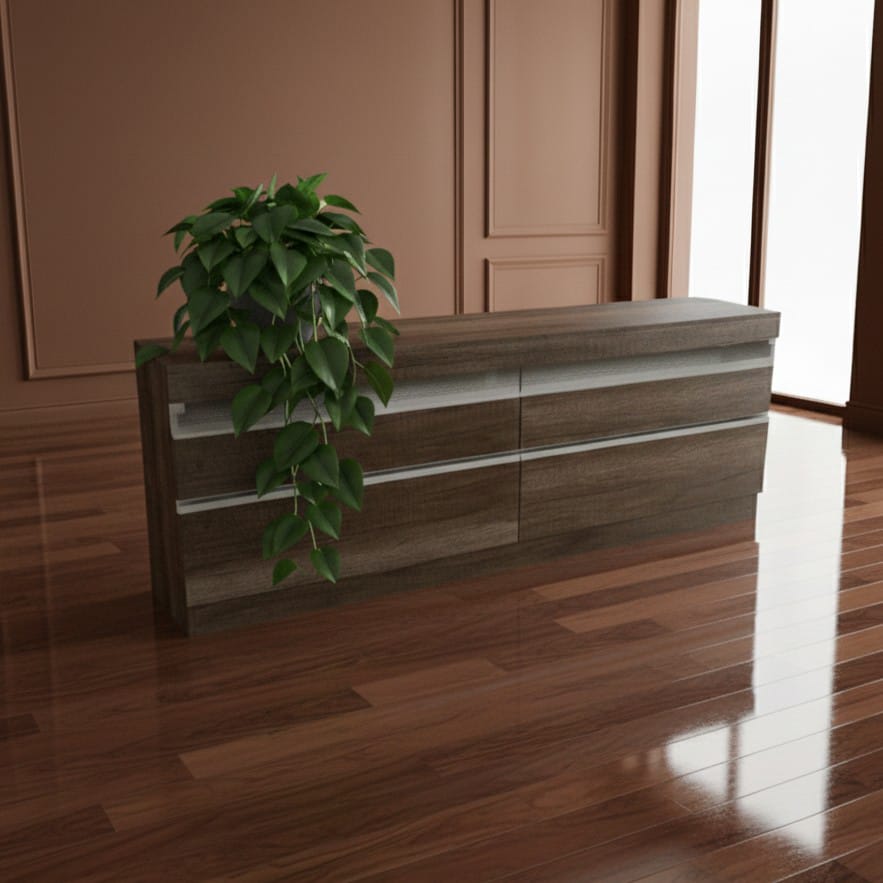 Bahiut con 2 puertas volcables con amortiguador neumático, cajones con gran espacio de guardado, perfiles de aluminio y detalles de esmerilado en los vidrios.
