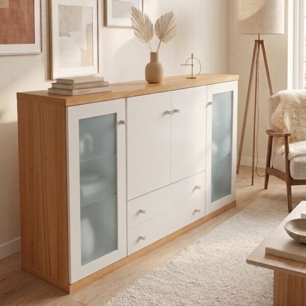Bahiut con 2 puertas volcables con amortiguador neumático, cajones con gran espacio de guardado, perfiles de aluminio y detalles de esmerilado en los vidrios.
