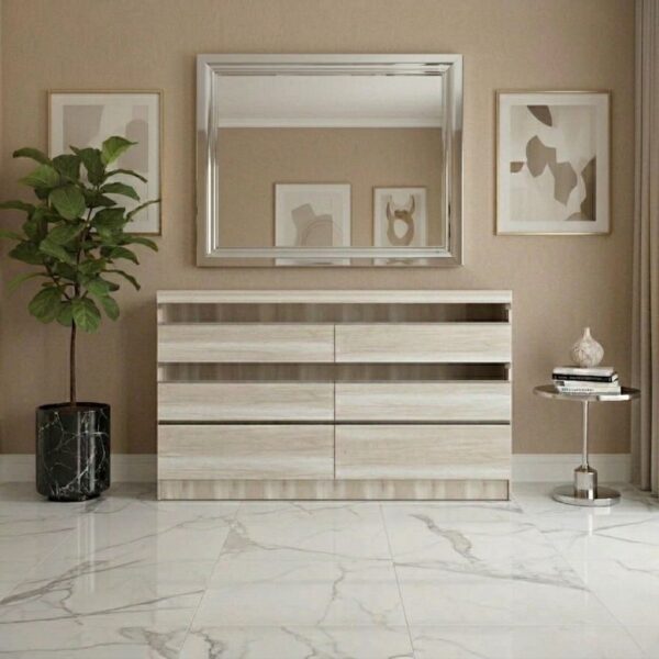 Bahiut con 2 puertas volcables con amortiguador neumático, cajones con gran espacio de guardado, perfiles de aluminio y detalles de esmerilado en los vidrios.