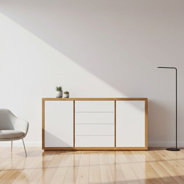 Posee 4 puertas volcables con amortiguador neumático, cajones de generosas dimensiones, perfiles de aluminio y detalles de esmerilado en los vidrios