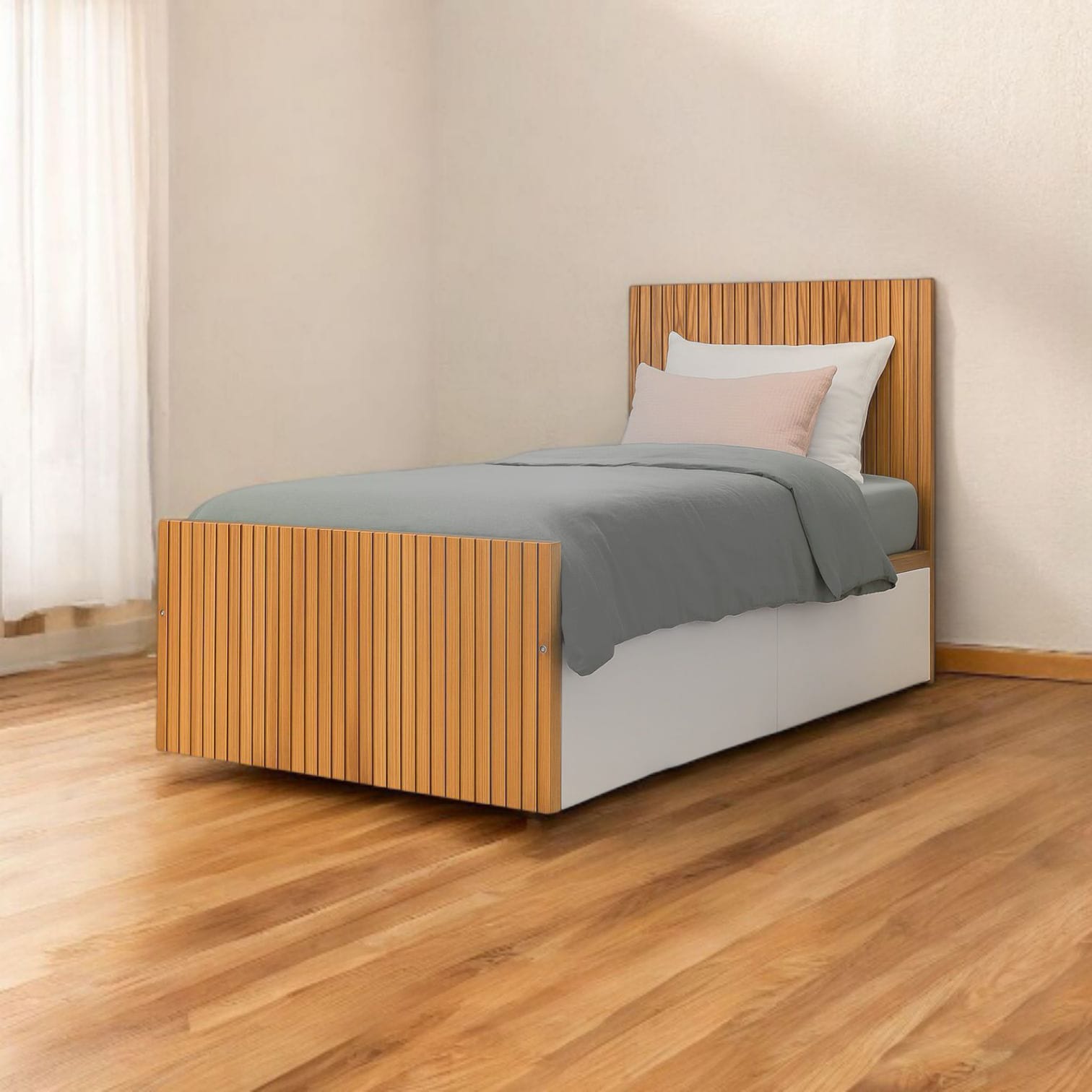 Fabricada en madera Paraiso ranurada, con un lustre natural que resalta sus vetas y aporta calidez a a cualquier dormitorio.
