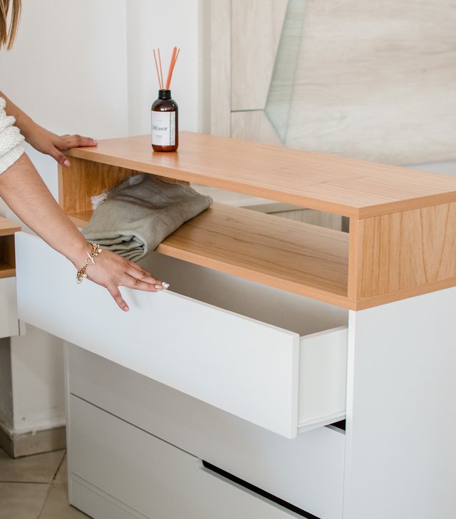 Cómoda de madera laqueada blanca. Techo en madera paraíso