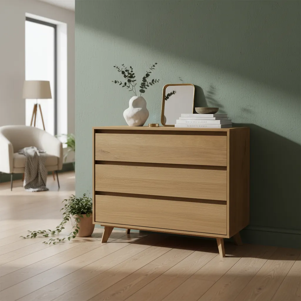 3 cajones amplios con correderas metálicas, estilo escandinavo/nórdico con patas en ángulo, ideal para ropa, accesorios, textiles o documentos. Estructura sólida y fácil de armar, combina con ambientes modernos, minimalistas o rústicos.