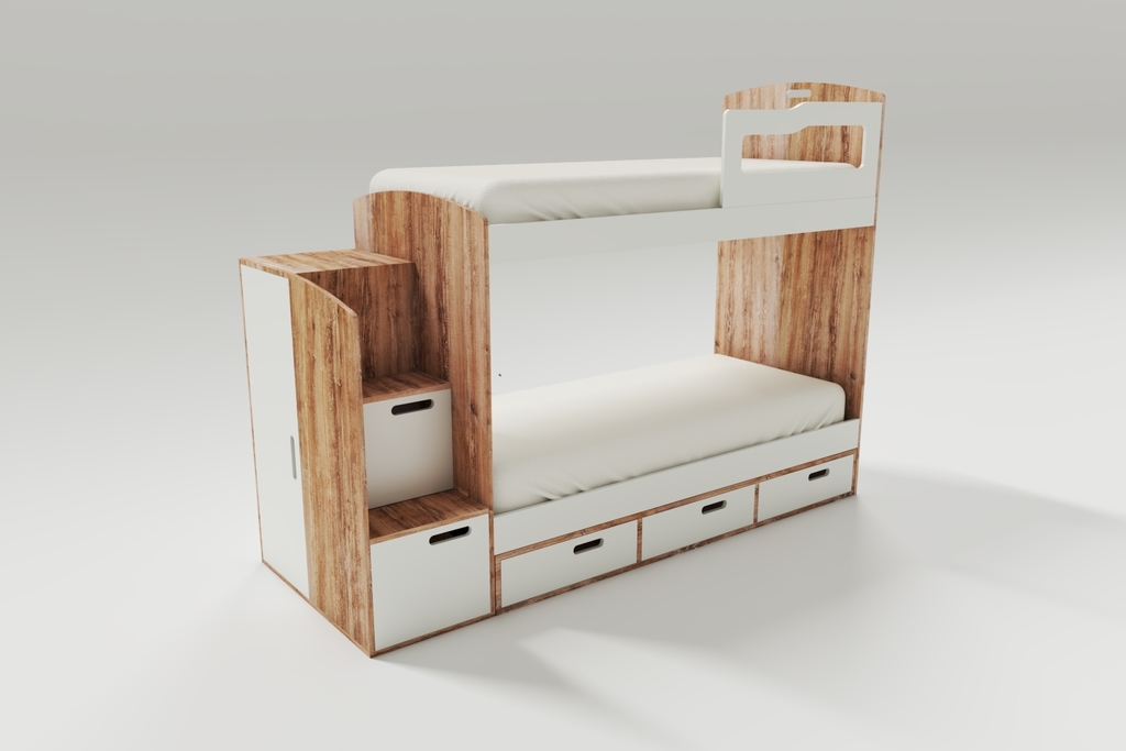 Apta para dos colchones de 1,90 x 0,80 mts. La cama cuenta con una escalera de cubos muy resistente que posee 3 compartimientos de guardado con puertas, una escalera segura y de muy fácil acceso. Puede venir con 3 cajones individuales terminados en laminado blanco con rueditas inferiores para armar o con carro cama. Sus grandes dimensiones generan un gran espacio de guardado, ideal para organizar el espacio de los más pequeños. La baranda de grandes dimensiones da seguridad al niño que duerma en la cama superior. La cama está terminada en laminado serrano (color madera) y laqueado blanco. Se realiza únicamente en los colores blanco y serrano.