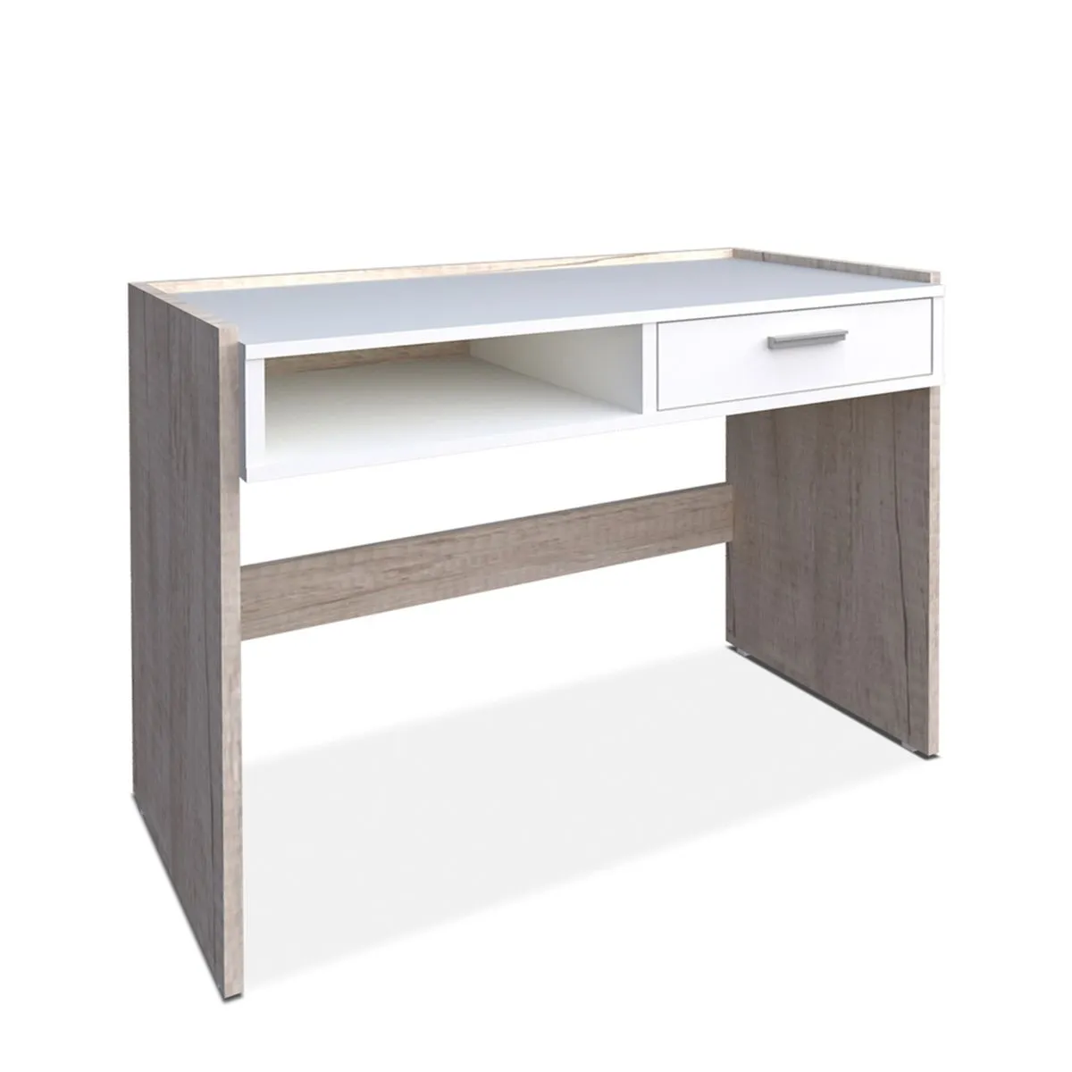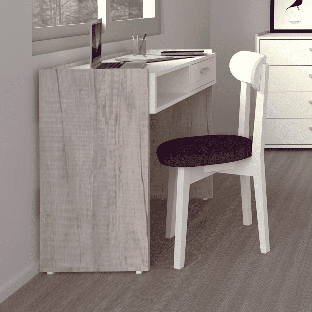 Escritorio ideal para espacios pequeños, de color blanco combinado con helsinky con un estilo moderno y práctico.