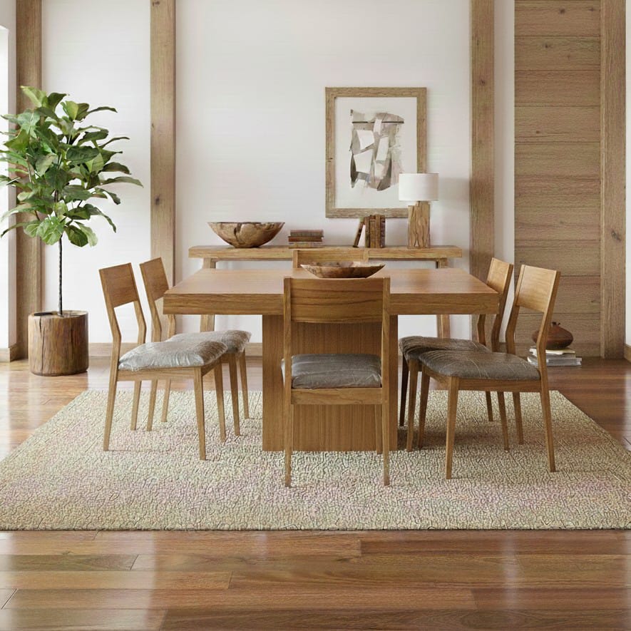 El juego de comedor está completamente realizado en madera Paraíso macizo, destacándose por su calidad, resistencia y calidez natural. Su diseño combina líneas simples y elegantes, lo que permite integrarlo con facilidad en distintos estilos de ambientación.