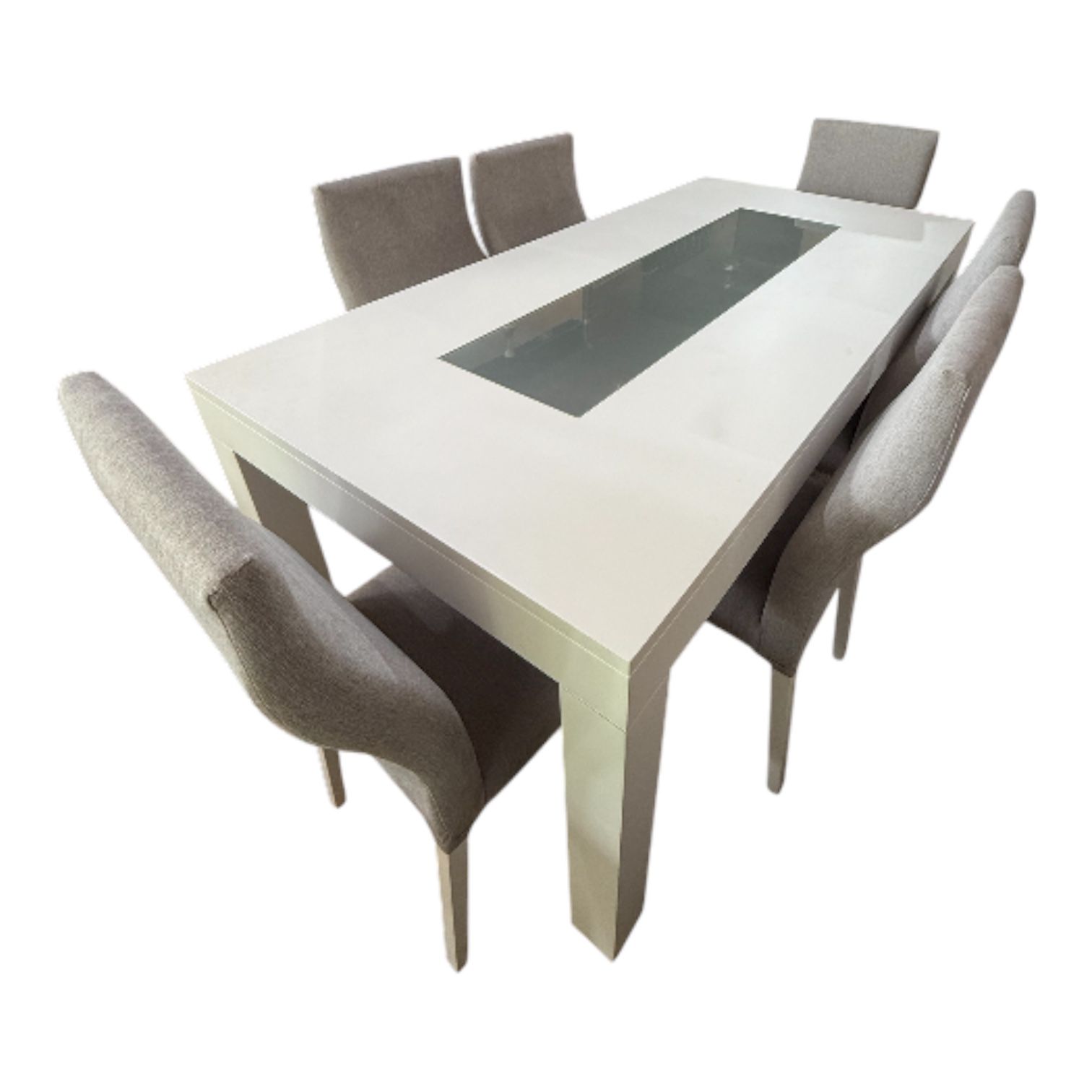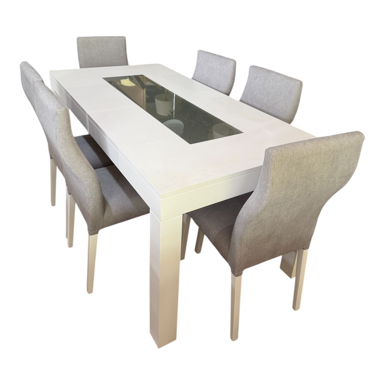 Mesa: laqueada en blanco, con tapa de vidrio central que realza su estilo y facilita la limpieza.