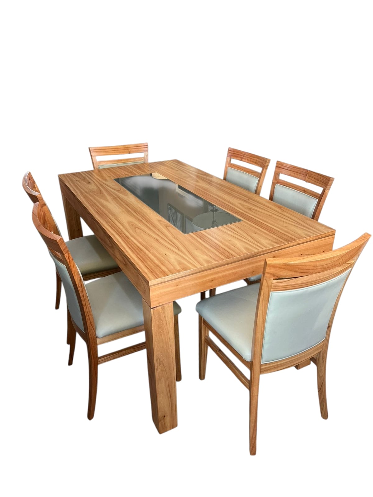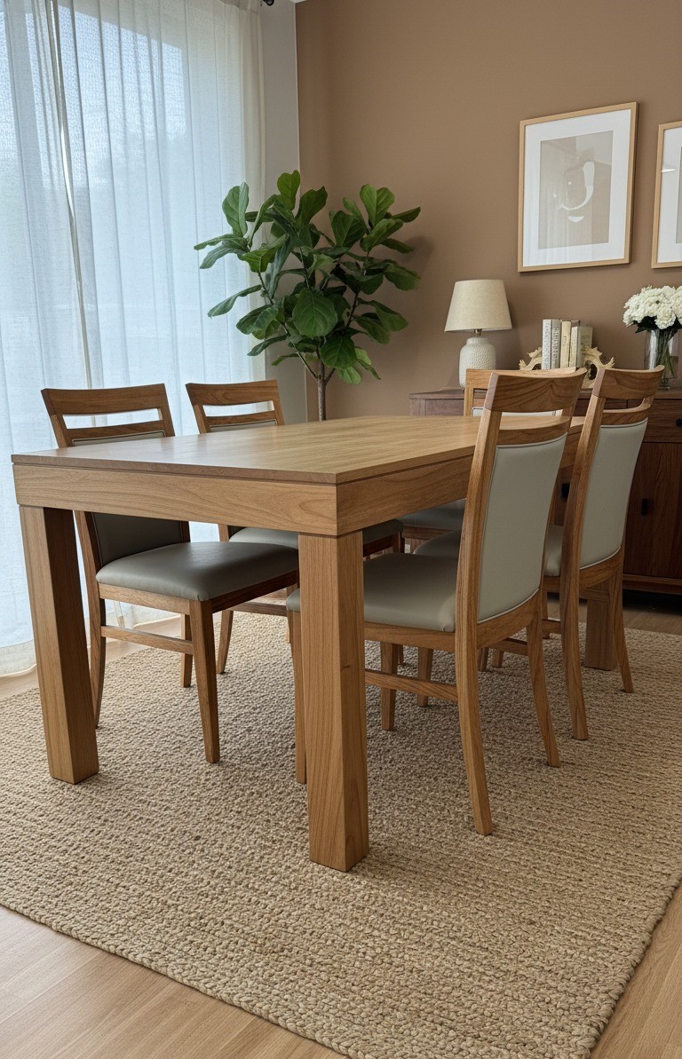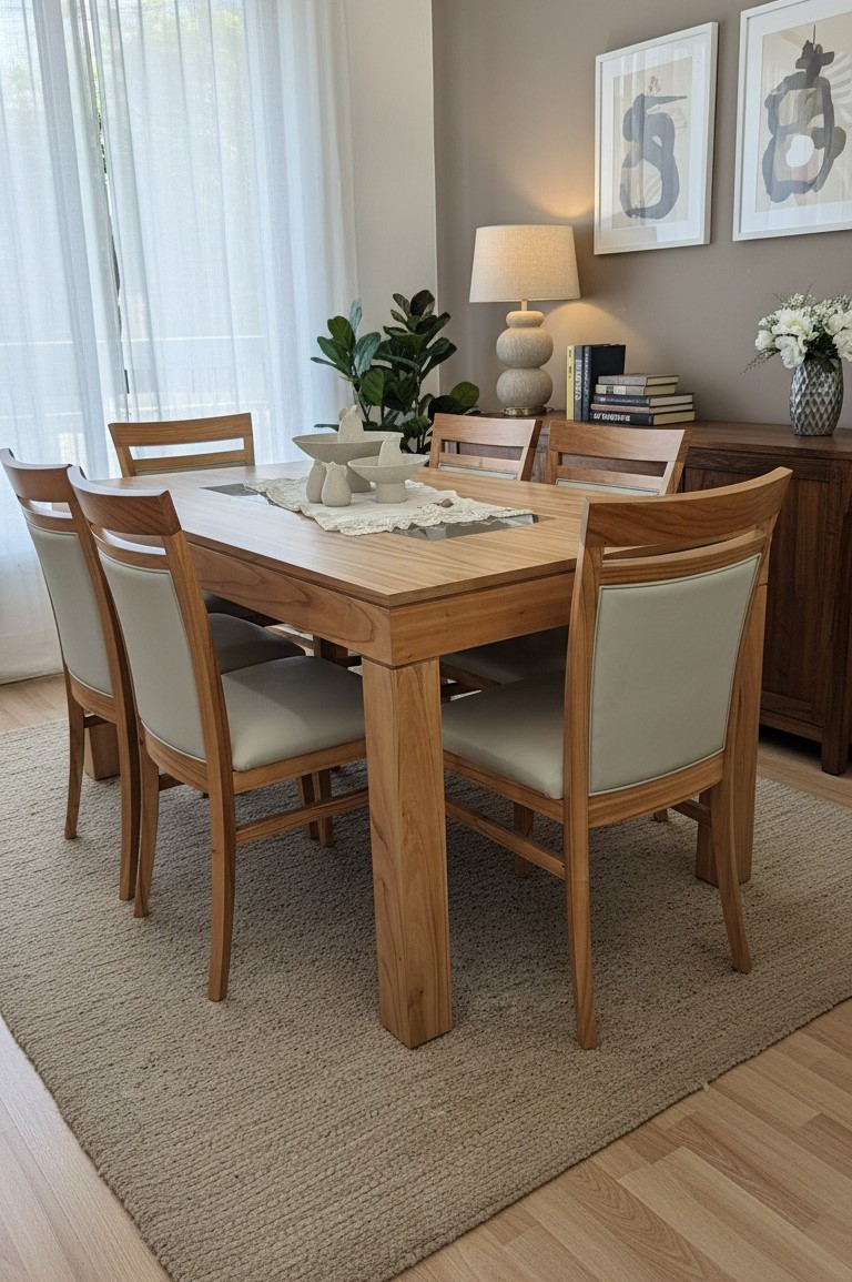 El juego de comedor está completamente realizado en madera Paraíso macizo, destacándose por su calidad, resistencia y calidez natural. Su diseño combina líneas simples y elegantes, lo que permite integrarlo con facilidad en distintos estilos de ambientación.