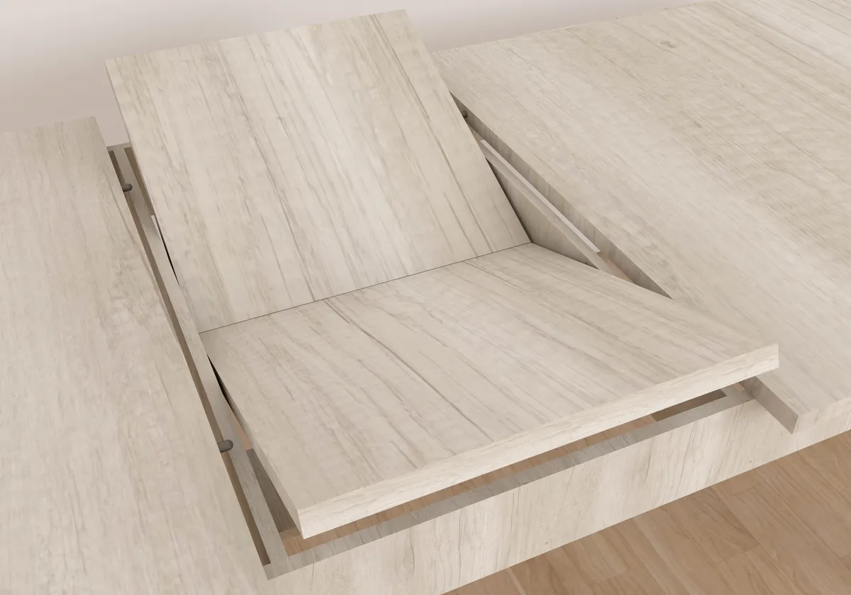 Sistema de corredera bidireccional automática que transforma una mesa de 180 cm a 225 cm. Con solo manipular uno solo de los extremos el otro se extiende automáticamente.