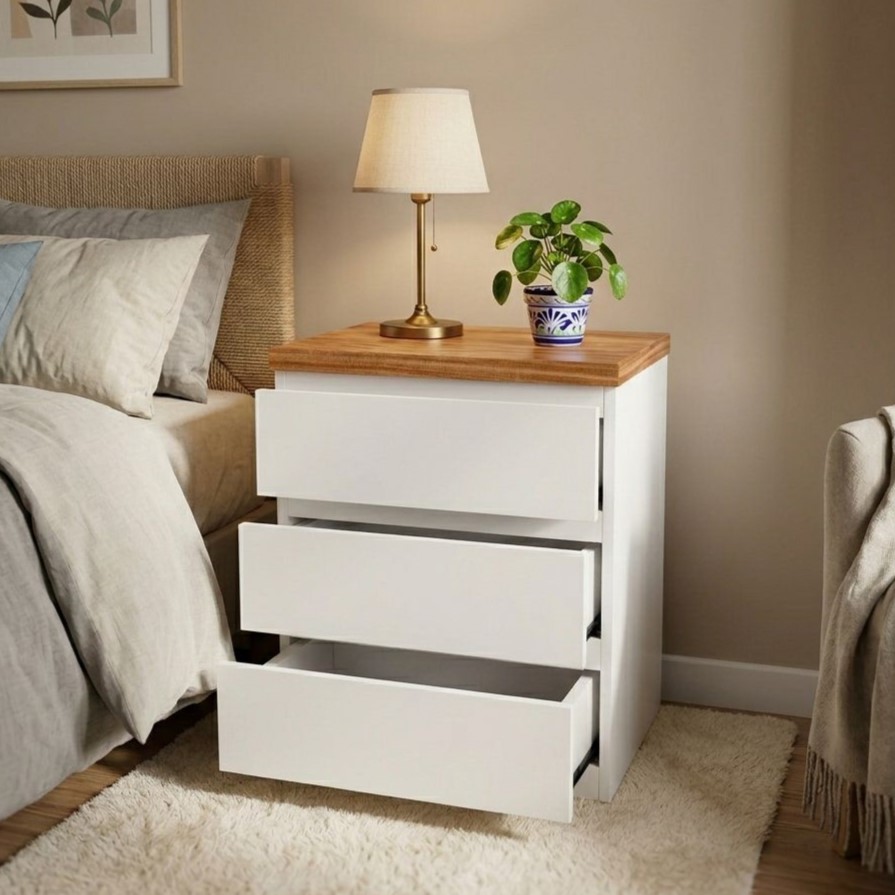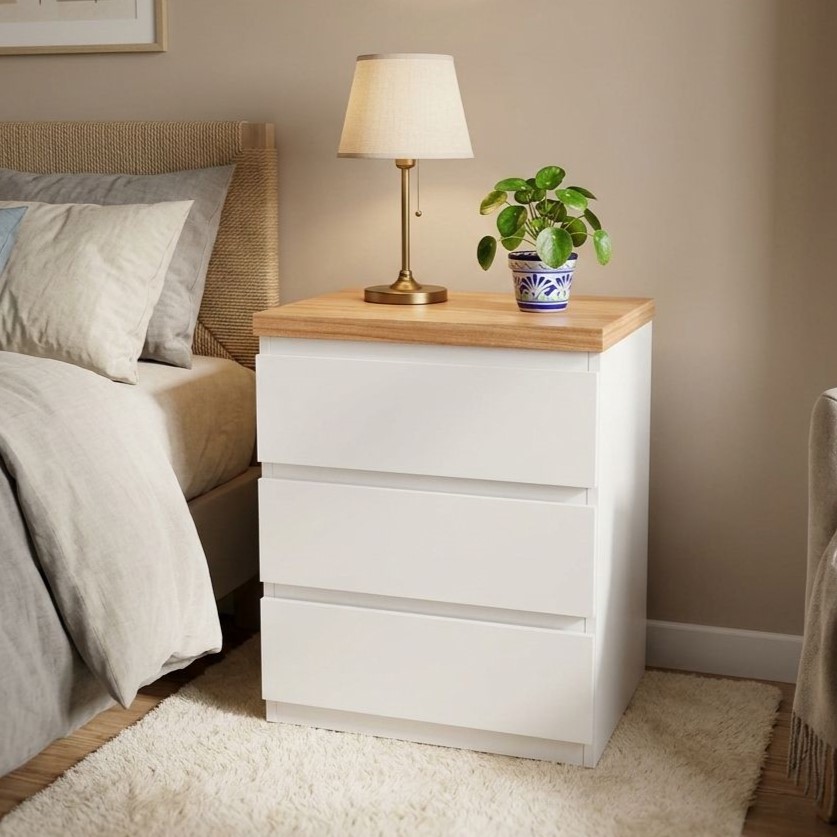 Mesa de luz fabricada en MDF macizo laqueado en blanco y tapa en madera paraiso.