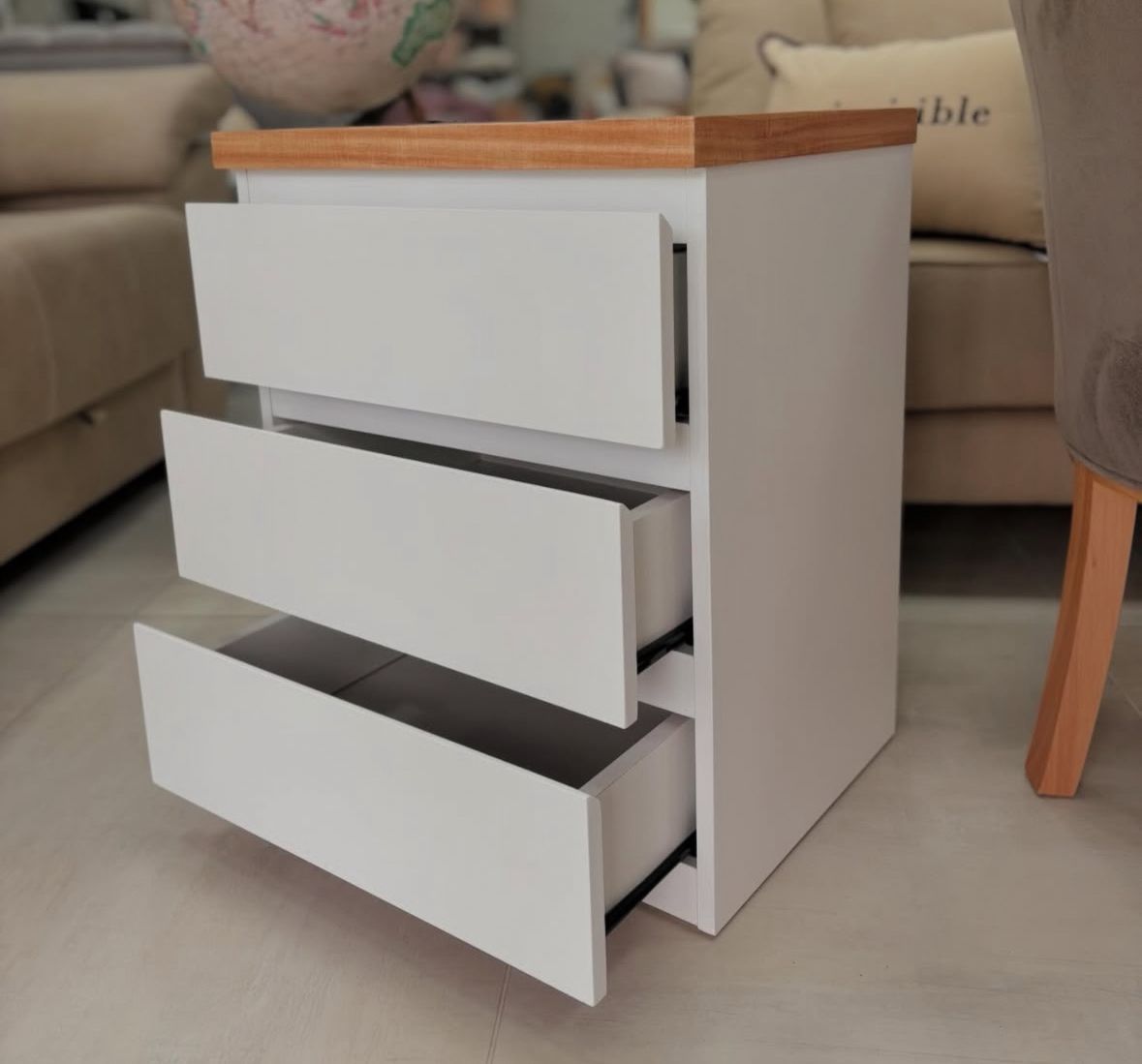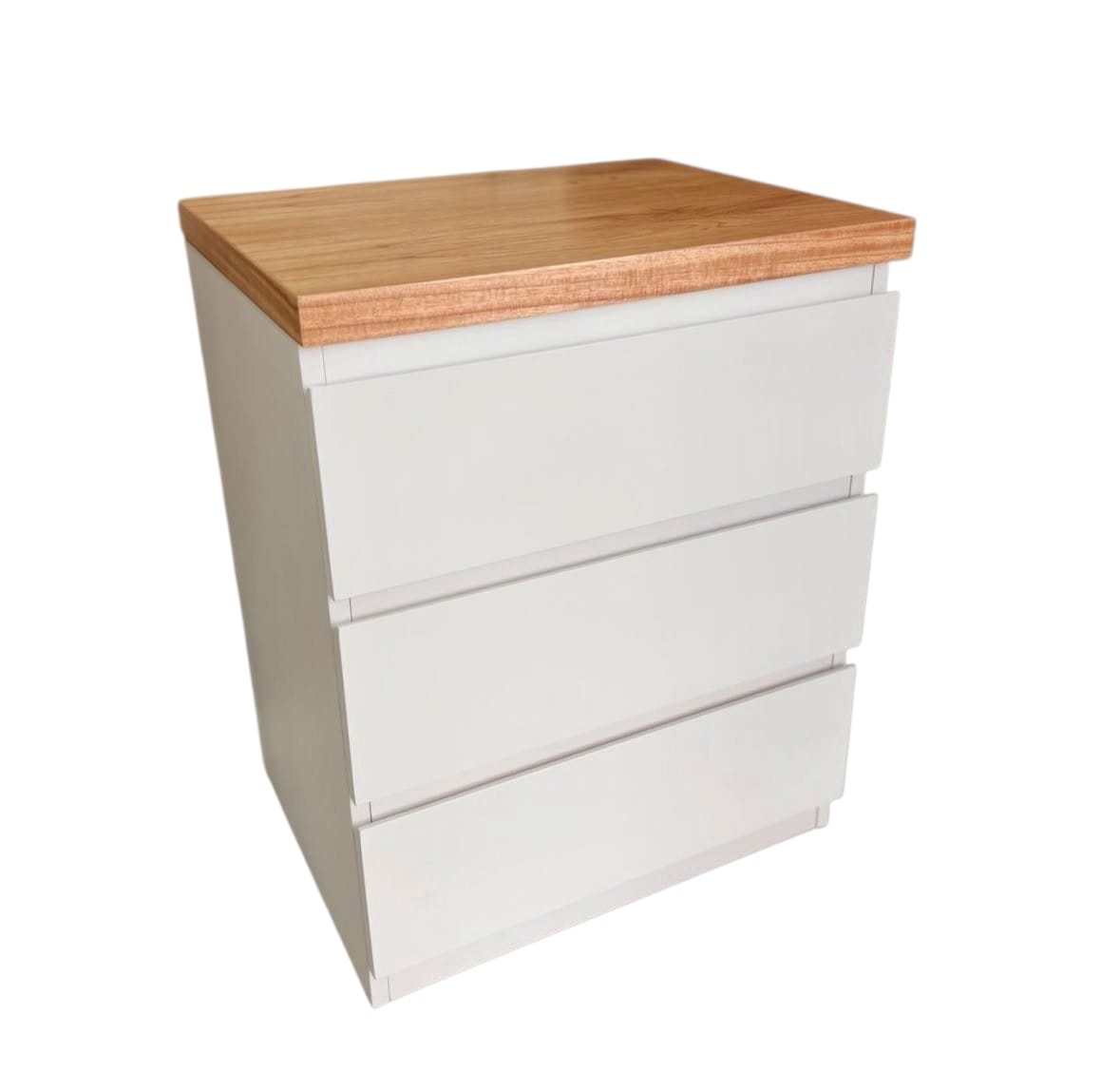 Mesa de luz fabricada en MDF macizo laqueado en blanco y tapa en madera paraiso.