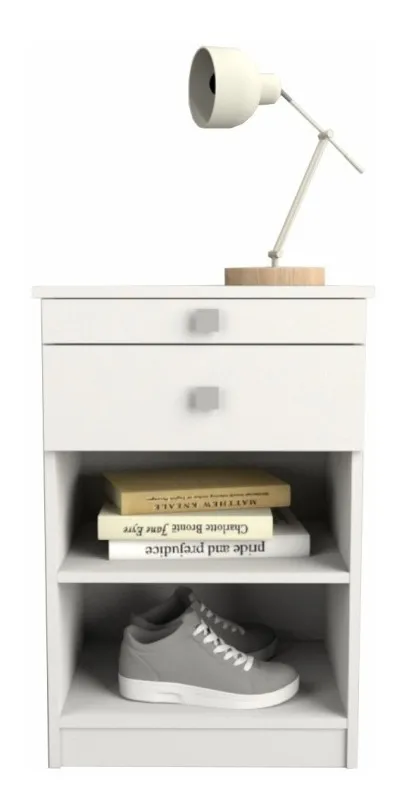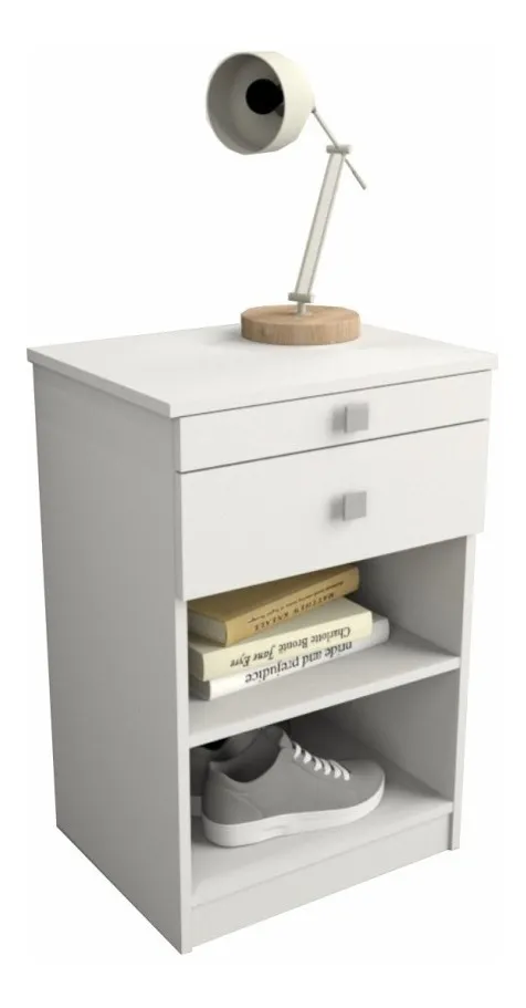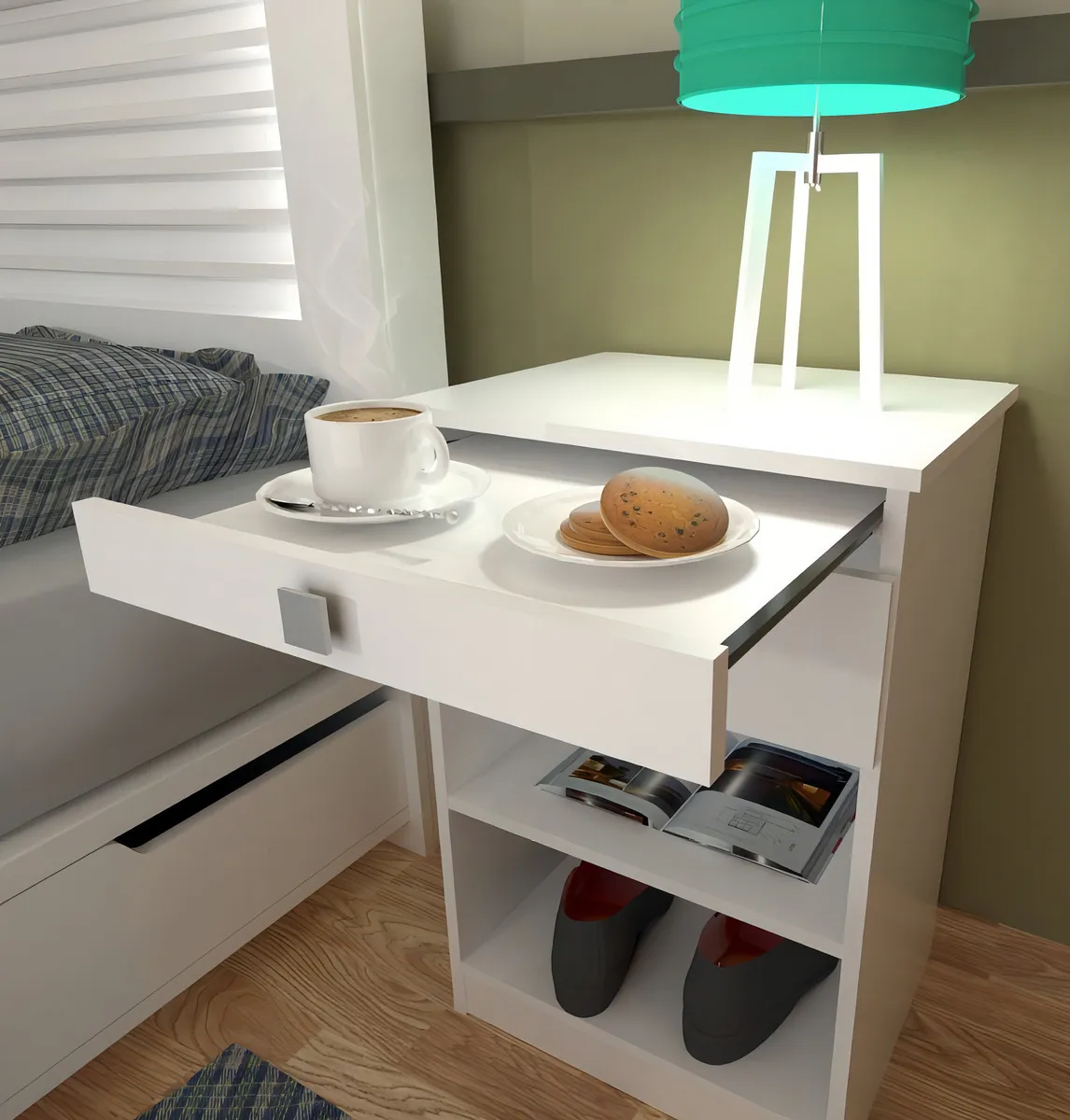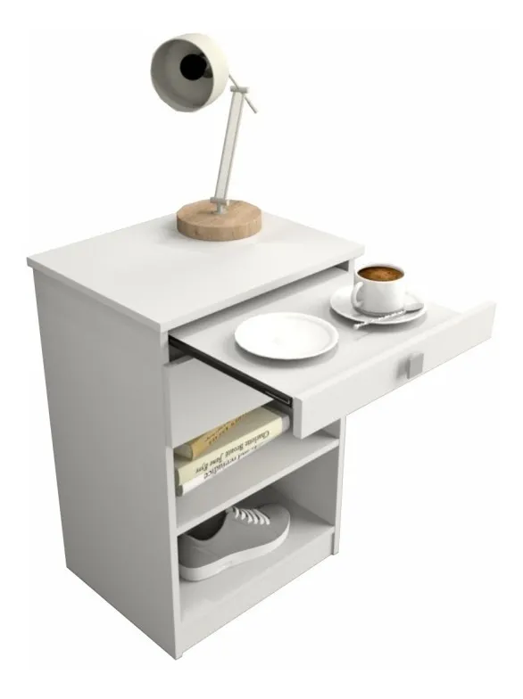 Si sos fan de desayunar en la cama esta es la mesita de luz para vos. Contiene una bandeja corrediza que podes usar para apoyar lo que necesites. Además cuenta con un cajón y un estante regulable en altura para ubicar según tus necesidades.