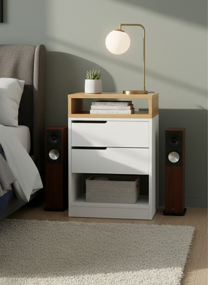 Mesa de luz fabricada en madera paraíso y madera laqueada blanca