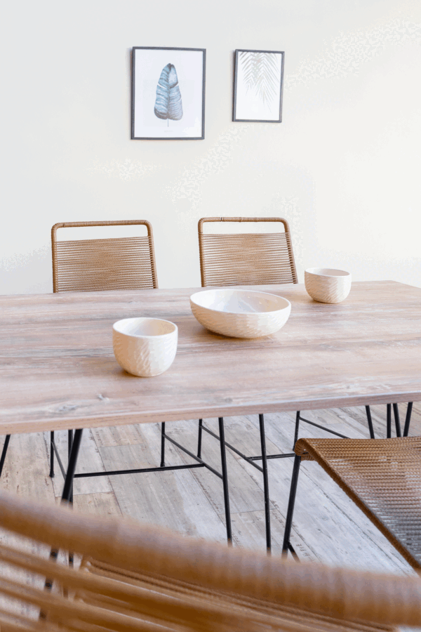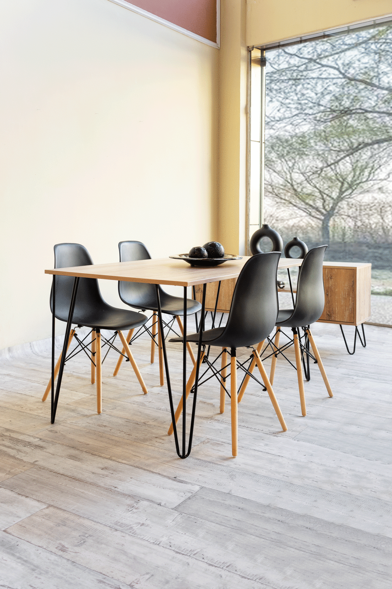 La mesa de la línea industrial es un producto logrado mediante la combinación de melamina símil madera color Atakama y las patas negras de hierro maciza.
