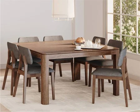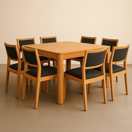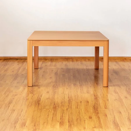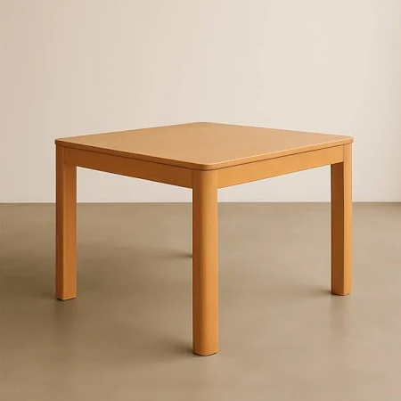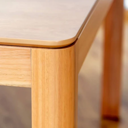 Patas 4 x 4 redondeadas, tapa con bisel a 45° y esquinas redondeadas.