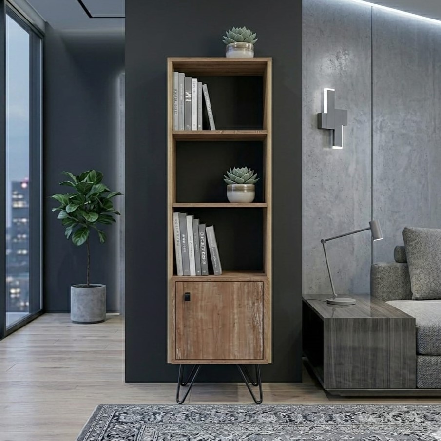 El módulo de un cuerpo de la línea industrial, se caracteriza por su acabado rustico. Este mueble posee tres divisiones internas,una cerradas con puertaa y dos libres. Cuenta con un tirador de color negro los cuales acompañan con la estética discreta del diseño