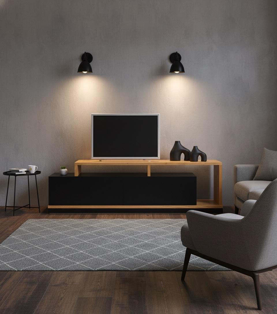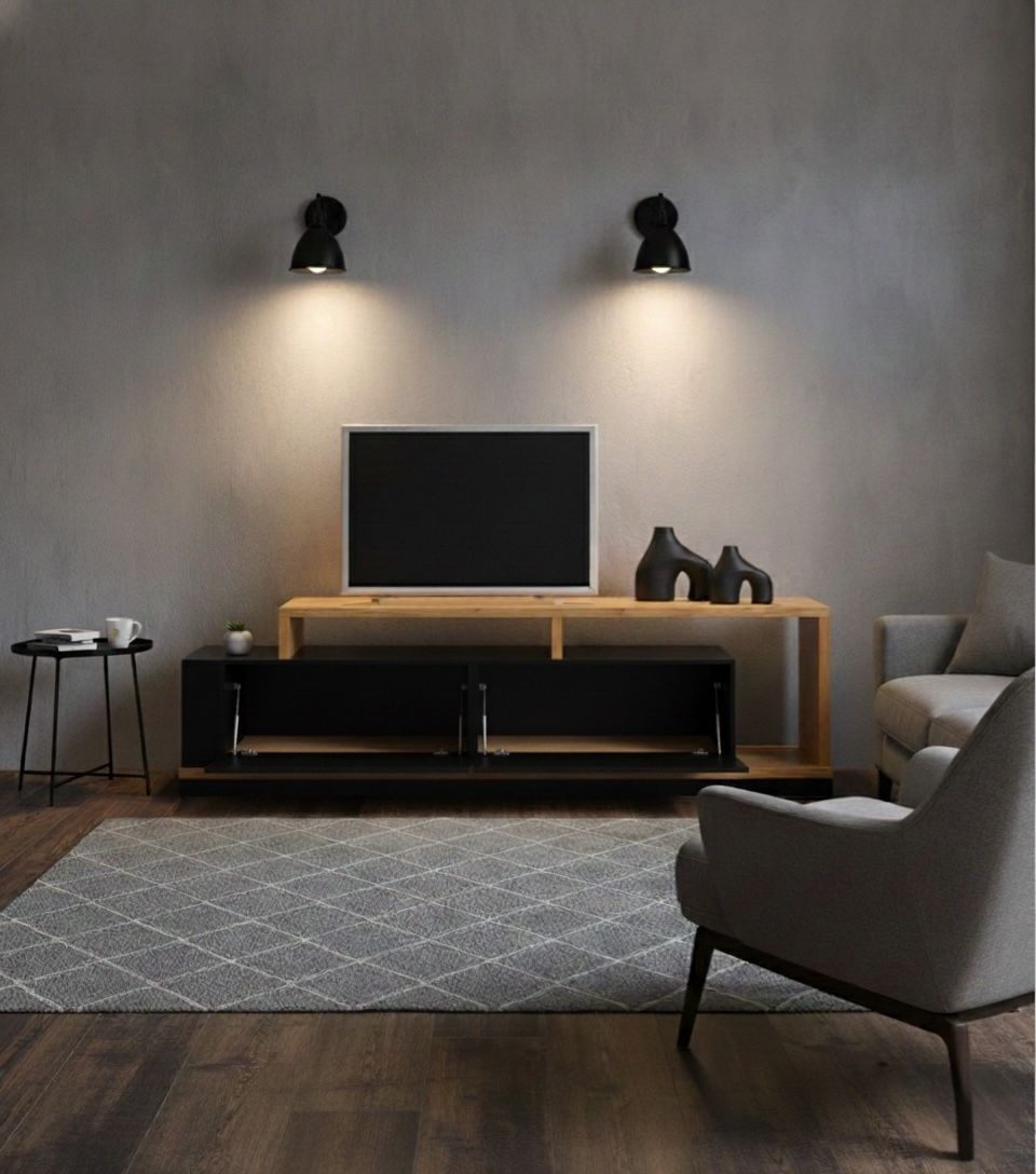 Rack combinado en madera paraíso y madera laqueada blanca