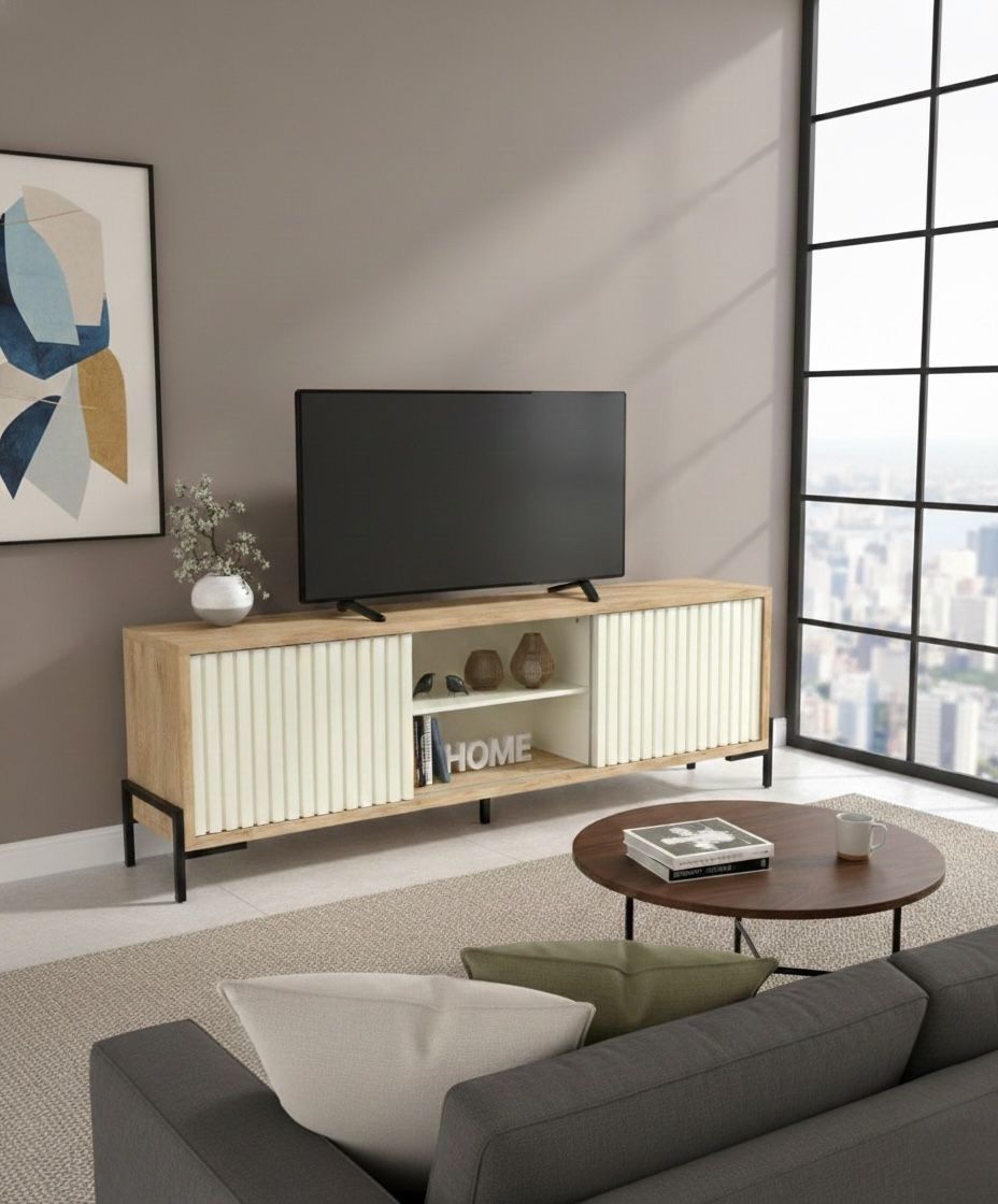 Descubre el Rack Varillado de 2 Puertas Corredizas con Estante, una pieza ideal para tu sala de estar. . Su atractivo color Roble Nebraska se adapta a cualquier decoración, mientras que su estructura de melamina de 15 y 25 mm garantiza durabilidad y resistencia. Este modelo cuenta con 2 puertas corredizas y un estante, ofreciendo un amplio espacio para almacenar tus dispositivos y accesorios.