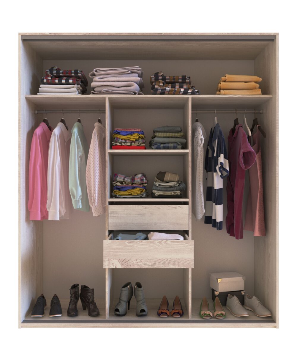 El Ropero Reflex de 3 puertas corredizas con espejos en las 3 puertas aúna elegancia y funcionalidad. Incluye 2 cajones y 5 estantes, correderas telescópicas, guía superior e inferior de puertas en aluminio con sistema de rodamiento con amortiguación y de altura regulable. Perfilería lateral de puertas y percheros en aluminio, otorgan a este ropero una apariencia moderna y sofisticada.