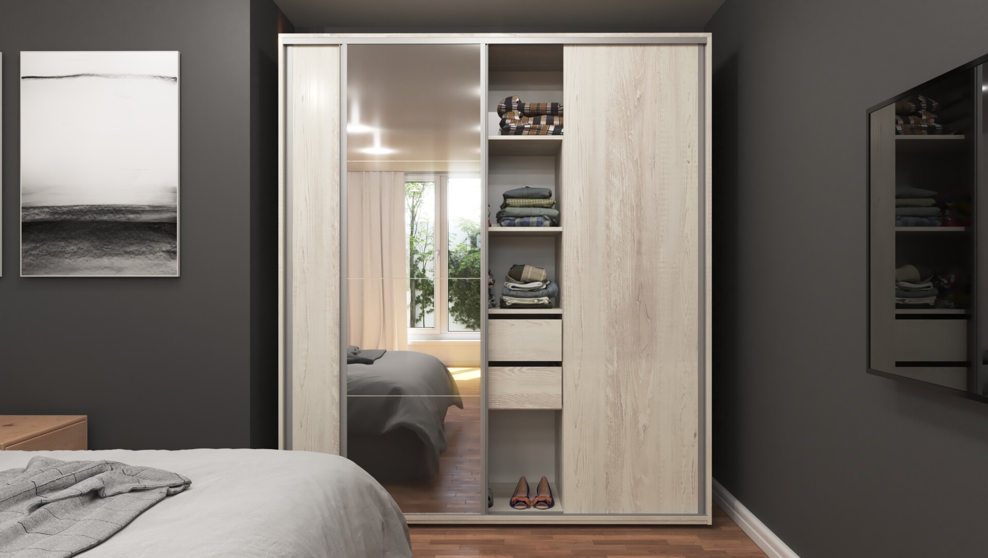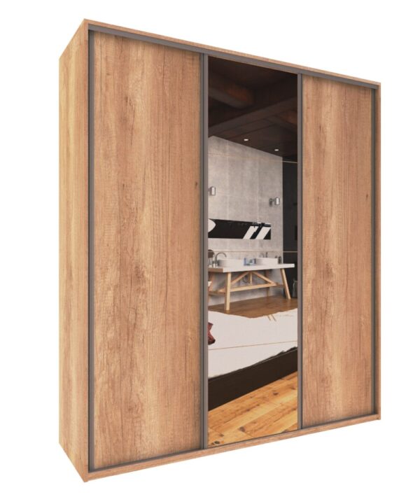 El Ropero Reflex de 3 puertas corredizas con espejo en la puerta central aúna elegancia y funcionalidad. Incluye 2 cajones y 5 estantes, ofreciendo una gran capacidad de almacenamiento. La perfilería lateral de puertas y percheros en aluminio otorga a este ropero una apariencia moderna y sofisticada.