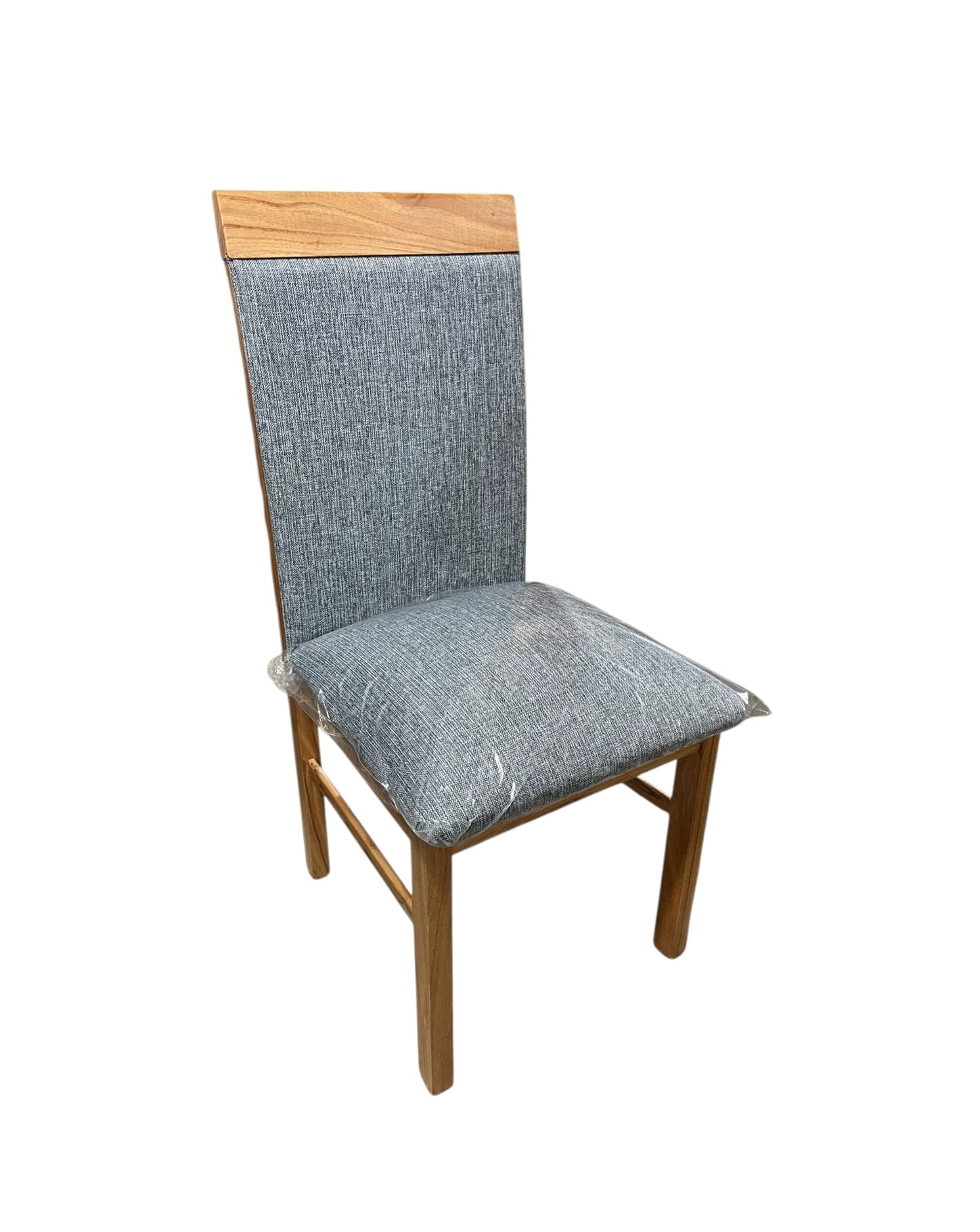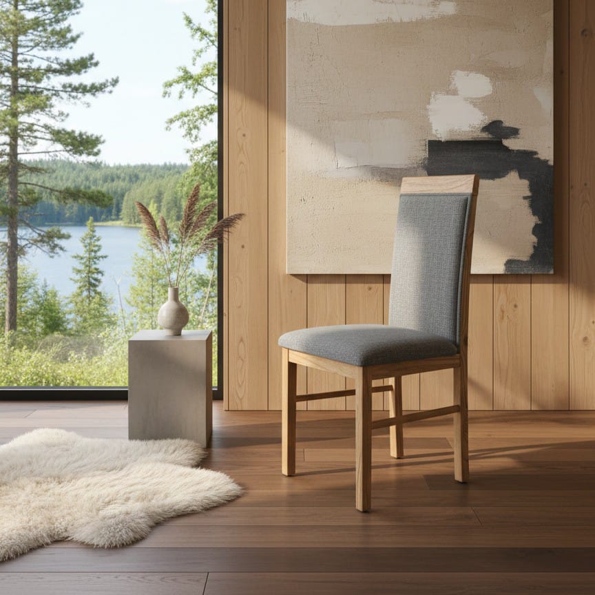 Silla tapizada en madera paraiso macizo, con respaldo alto y asiento de espuma de alta densidad.